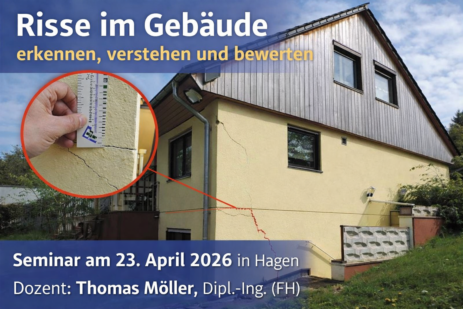 Das Seminar vermittelt die wesentlichen Grundlagen zur Beurteilung von Rissen in und an Gebäuden. Im Mittelpunkt steht die Frage, wie unterschiedliche Rissbilder erkannt, richtig eingeordnet und im praktischen Zusammenhang bewertet werden können.