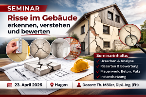 In diesem praxisnahen Präsenzseminar am 23.04.2026 vermittelt Thomas Möller, Dipl.-Ing. (FH), fundiertes Wissen zur Erkennung, Analyse und Bewertung typischer Rissbilder an Gebäuden. Behandelt werden Risse in Mauerwerk, Beton, Innen- und Außenputz sowie im Wärmedämmverbundsystem – inklusive möglicher Ursachen und erster Einordnung von Instandsetzungsansätzen. Das Seminar richtet sich an Sachverständige, Regulierer, Makler und alle Immobilienpraktiker, die Schäden fachlich sicherer beurteilen möchten.